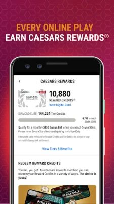 Embrace the same rewarding experience you've come to love by playing online, where every wager you make will earn you both Reward Credits and Tier Credits. You can easily redeem your Reward Credits online or at any of our 50+ Caesars Rewards destinations.